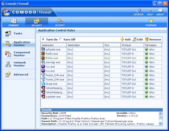 Comodo Firewall Pro - небольшой, бесплатный брандмауэр для защиты компьютеров с операционными системами Windows. Программа обладает простым и удобным интерфейсом, выводит детальную информацию (IP адреса, открытые порты, путь приложения и т.д.) обо всех соединениях. Встроенная в Comodo Firewall Pro база позволяет автоматически определять и выставлять нужные параметры для работы с более чем десятью тысячами приложений. *